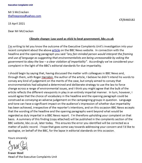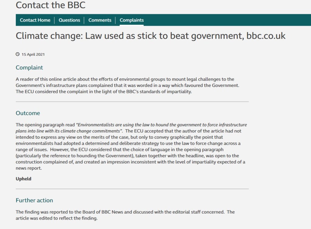 We write to complain about the article Climate change: Law used as stick to beat government – BBC News written by “environmental analyst” Roger Harrabin and published on the BBC website on 19/12/20.