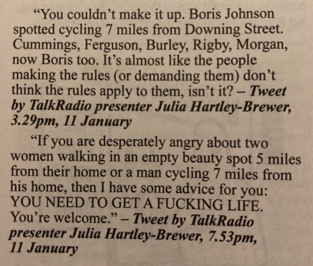 Liddle hasn’t been as outspoken as Toby Young on Covid-19 (in an interview on why he changed his mind on lockdown he points out that “I rather liked lockdown, you don’t have to meet people, just fucking great mate!”), but his toxic views are never too far away.