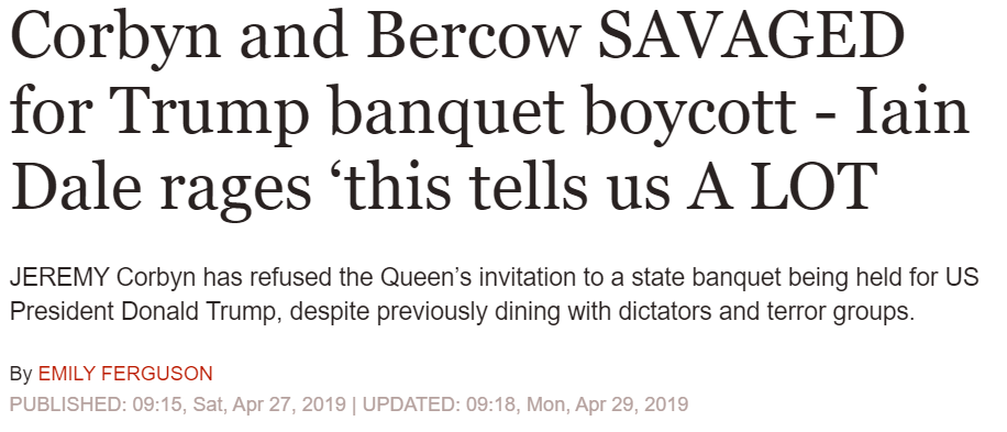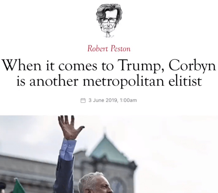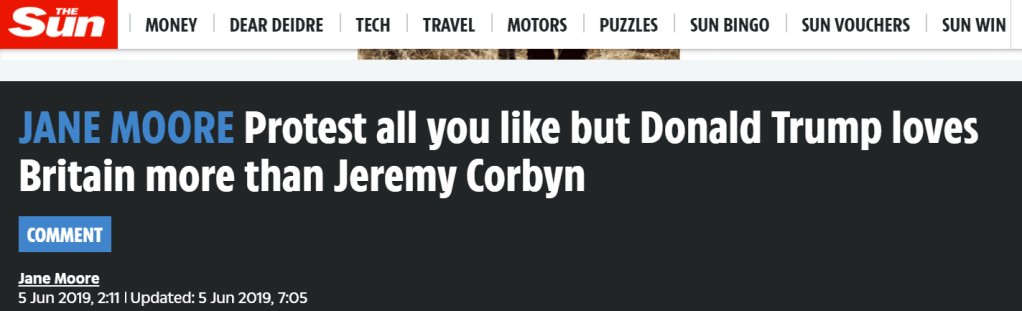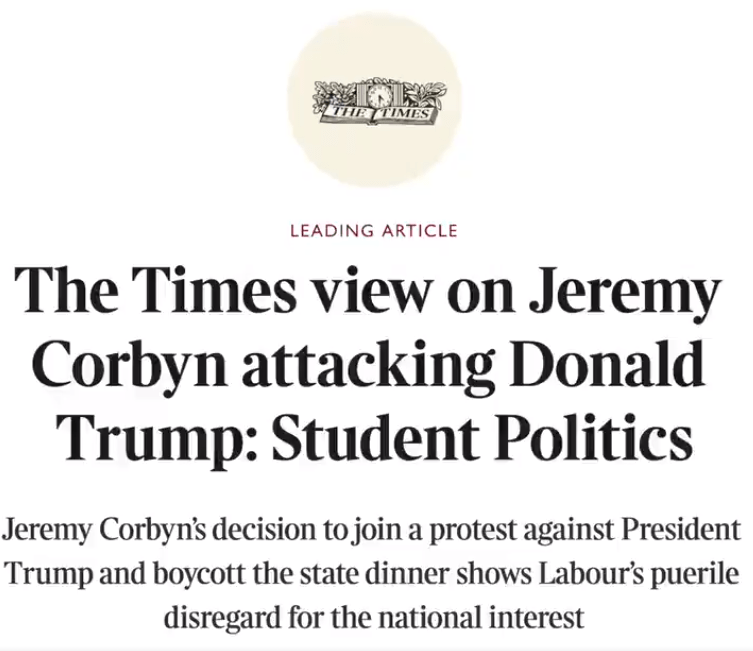 Here’s Corbyn on Trump’s state visit to the UK in 2019, which he, virtually alone among the British political class, boycotted: “Theresa May should not be rolling out the red carpet for a state visit to honour a president who rips up vital international treaties, backs climate change denial and uses racist and misogynist rhetoric.”