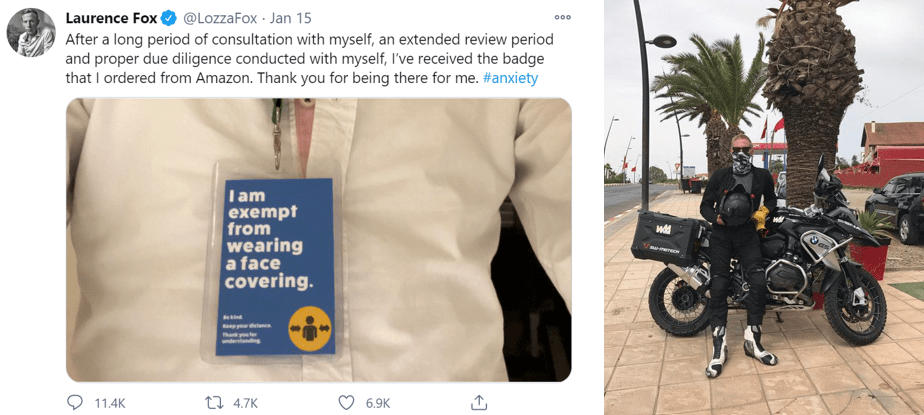 Laurence Fox, as you’ll see below, mocks the concept of wearing a mask to protect others, but seems in favour of them when they make you look cool on your motorcycle…