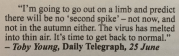 “Rather than admit he hugely overestimated the danger of Covid, (Boris Johnson) continues to insist it is a deadly plague and that it will be back soon in a terrible second wave.” (September 13th, 2020)