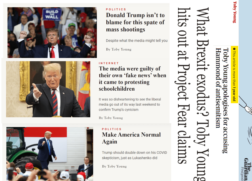Surely Toby Young is an aberration? The British free press, comprised of aged respectable journals like The Times (“trusted, insightful journalism”), The Spectator (“world-class journalism”) and The Telegraph (“committed to quality journalism ‑ the very best reporting, comment and analysis making sense of the day’s biggest stories”), couldn’t tolerate more than one chronically incorrect, attention-seeking loudmouth…