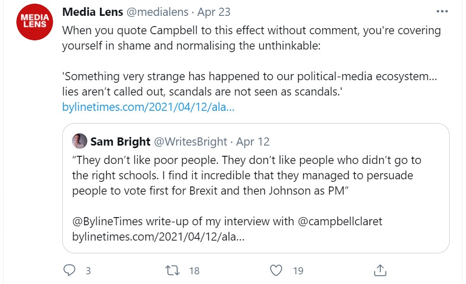 Such a “constrained” view of Campbell is typical of the corporate media. Journalists working within a system driven by business interests (as explained by the propaganda model) would be expected to self-enforce parameters of discussion that bar powerful figures like Campbell and Blair being branded as criminals for acts committed while in charge of state-corporate affairs.