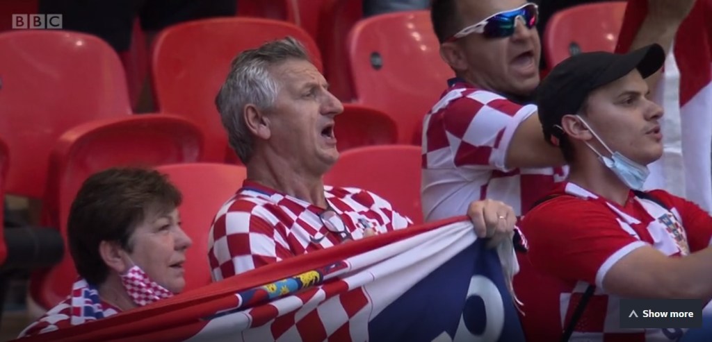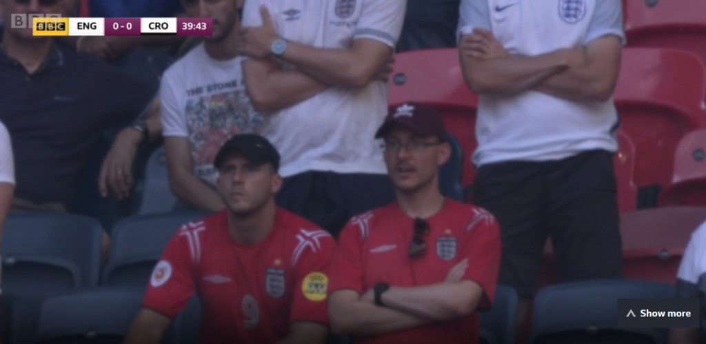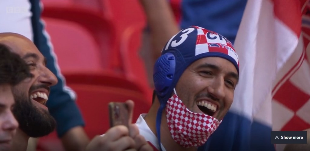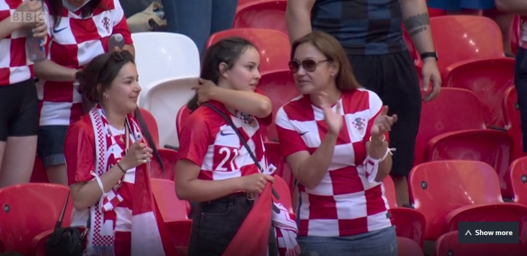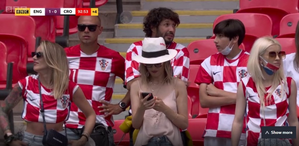 22 fill shots were selected in total from England-Croatia. Seven of these images predominantly feature or focus on women. We would argue that at least five of the shots (71%) have been selected because the women connote the quality of “to-be-looked-at-ness” identified by Laura Mulvey and match Western media stereotypes of female attractiveness.