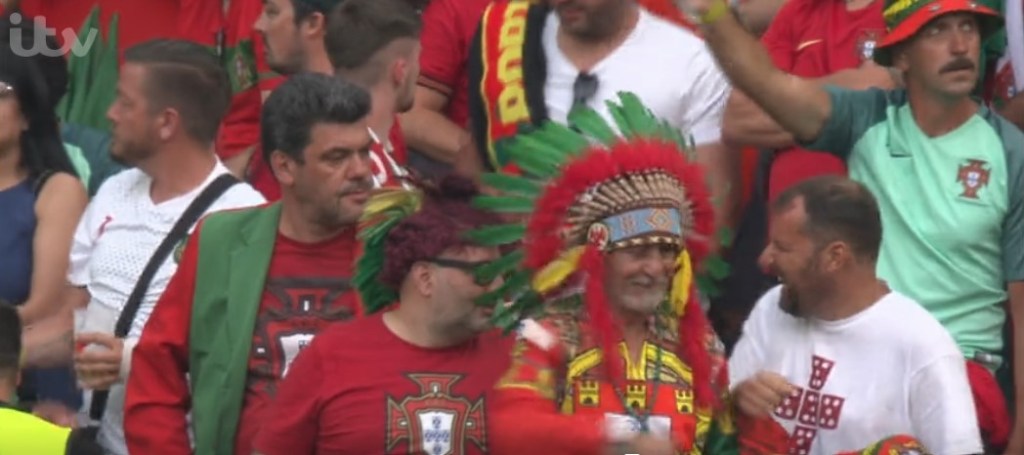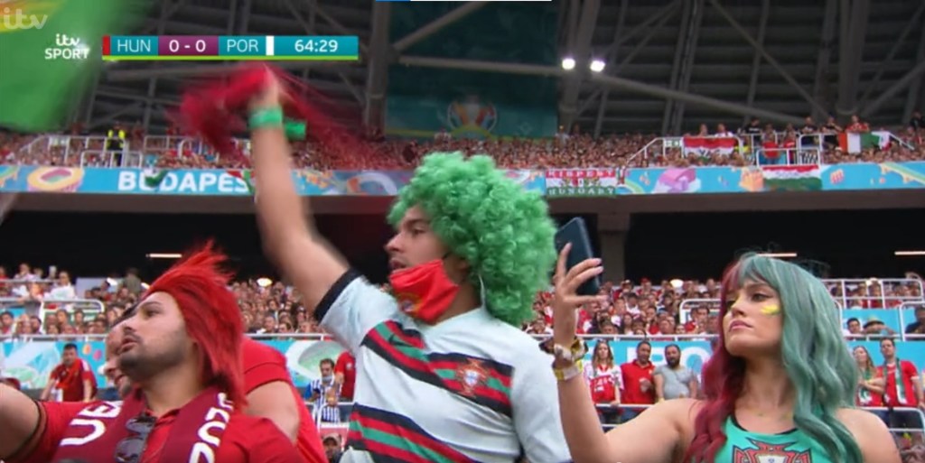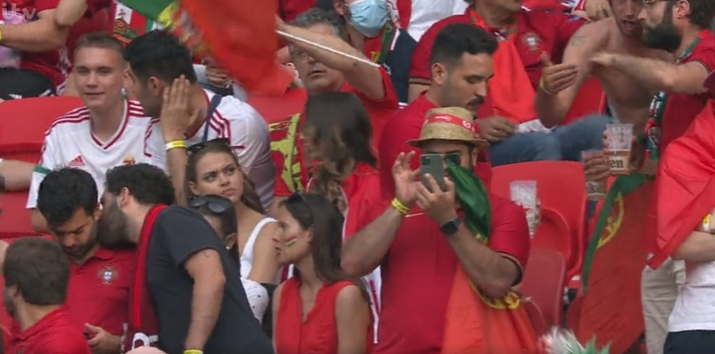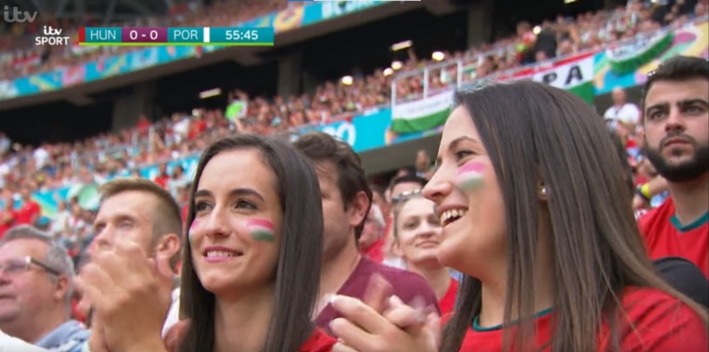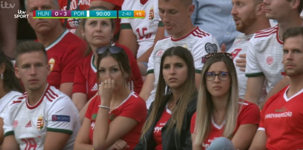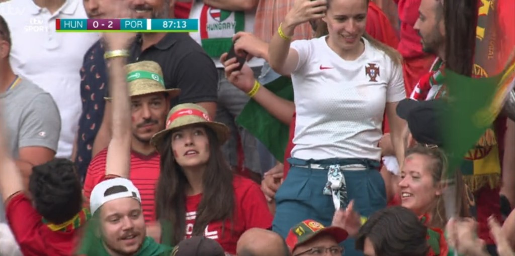 We looked through all the images from Hungary-Portugal and, while we identified an additional shot of a male child enjoying the match with his family, could not identify corresponding footage of a female child. Likewise, a number of men in their 40s, 50s and 60s are shown but only one women in this age range makes an appearance (and, arguably, is selected because she is at the youthful end of this spectrum and “attractive”).