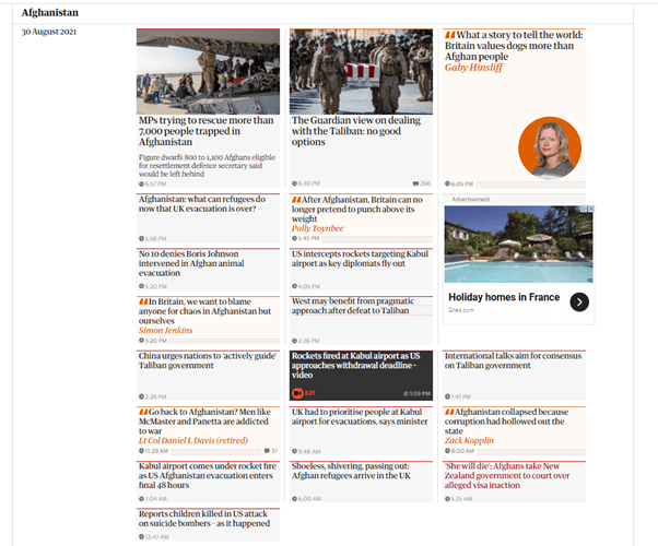 The Guardian usually “pins” a topic at the top of its home page to signify that it is the most important news story of the moment. For the last two weeks of August the topic was Afghanistan.