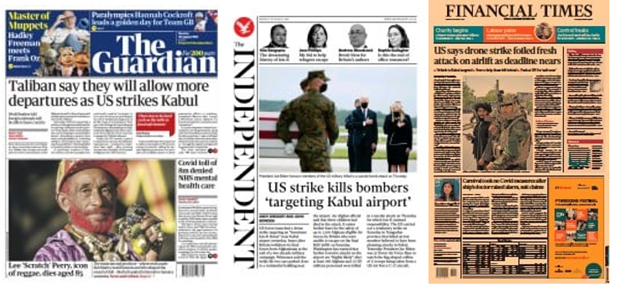 We clicked on The Guardian’s Afghanistan tag to carry out an overview of their coverage of the airport terror attack and the US drone attack.