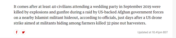 A final piece of context: Just a few days before the fatal drone strike, on 26th August, terrorists struck at Kabul airport. The UK press devoted countless articles to the death of civilians and US service personnel at the airport (initial reports suggested 100+ deaths). Would they display comparable interest when it is the West, not bogeymen terrorists, responsible for carnage and civilian deaths?