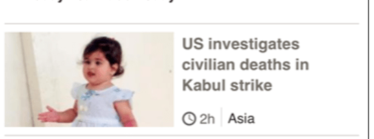 To their credit, the BBC did post a couple of videos on the 30th of August highlighting the human toll of the drone strike – ‘Why did they kill our family… our children?’ and ‘Ten people died here.. including my daughter’