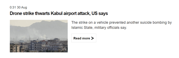 On 28th August the Guardian Afghanistan tag contains three airport attack headlines, while on 29th August two headlines refer to it. As late as 3rd September, a week after the attack, there were still headlines devoted to it – British Troops ‘Metres Away’ from Kabul Bomb Blast Given Therapy.