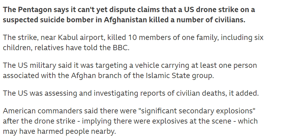 Here is the US attempting to justify itself – with the full support of the BBC. “A US drone strike in the Afghan capital Kabul has prevented another deadly suicide attack at the airport, US military officials say,” is how the article begins. You will note, again, that the US military position is to the fore.