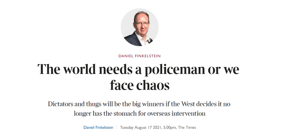 A searing but sad article. “The West” has no scruples when it engineers conflicts in countries that it has no desire to empathise with and all in the name, of course, of “national interest”, a.k.a.~ “self-interest”.The contrast between Daniel Finkelstein’s words and Noam Chomsky’s philosophy is stark. If the world “needs a policeman”, who, exactly, has the right to decide who that should be ?