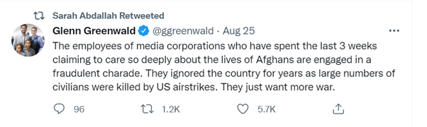 Afghanistan has dominated media headlines throughout August, with MSM outlets and voices alternating expressions of their true concern (declining US/UK military power) with false concern (the wellbeing of Afghan civilians and women’s rights).