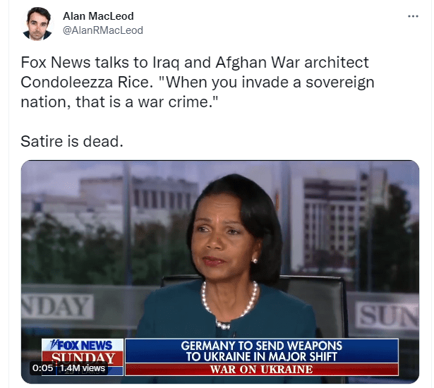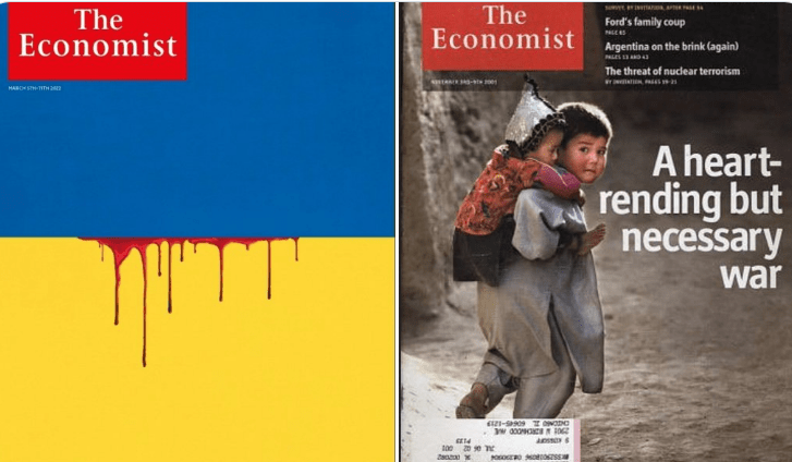 The most obvious Ukraine War hypocrisy has been documented in a series of parallel images by journalist Alan MacLeod. As you can see, according to the corporate media Russia’s invasion is brutal, illegal, dripping in blood. Our invasions are…”heart-rending but necessary”…and even “open the door to peace”.