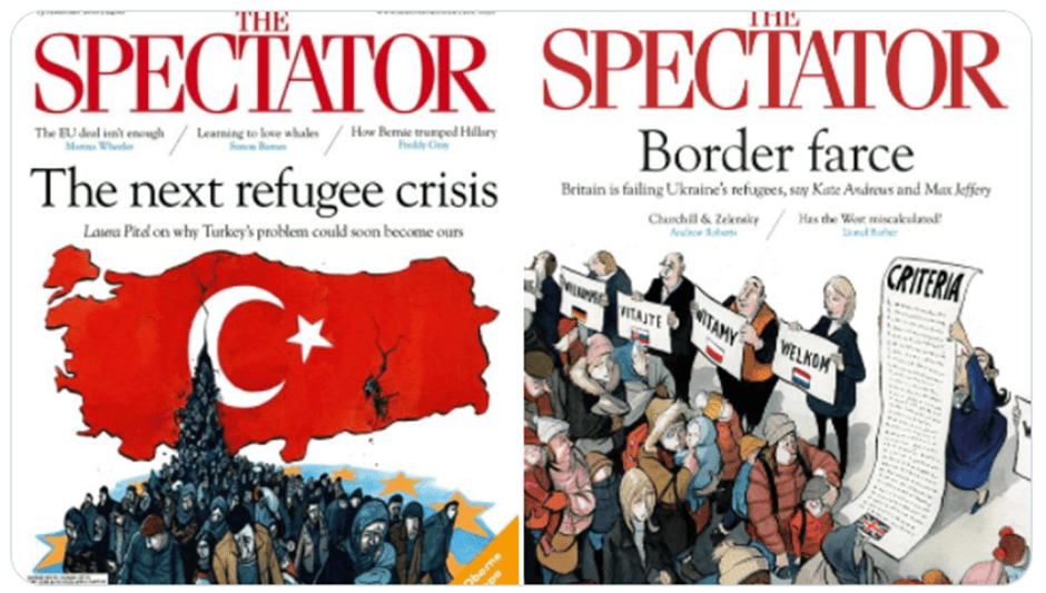 The Mail will be comforted to know they have “highbrow” company in the gutters of hypocrisy. Here’s the pseudo-intellectual Spectator representing Turkish migrants as zombie army “problem” but putting a very different spin on Ukrainian refugees: