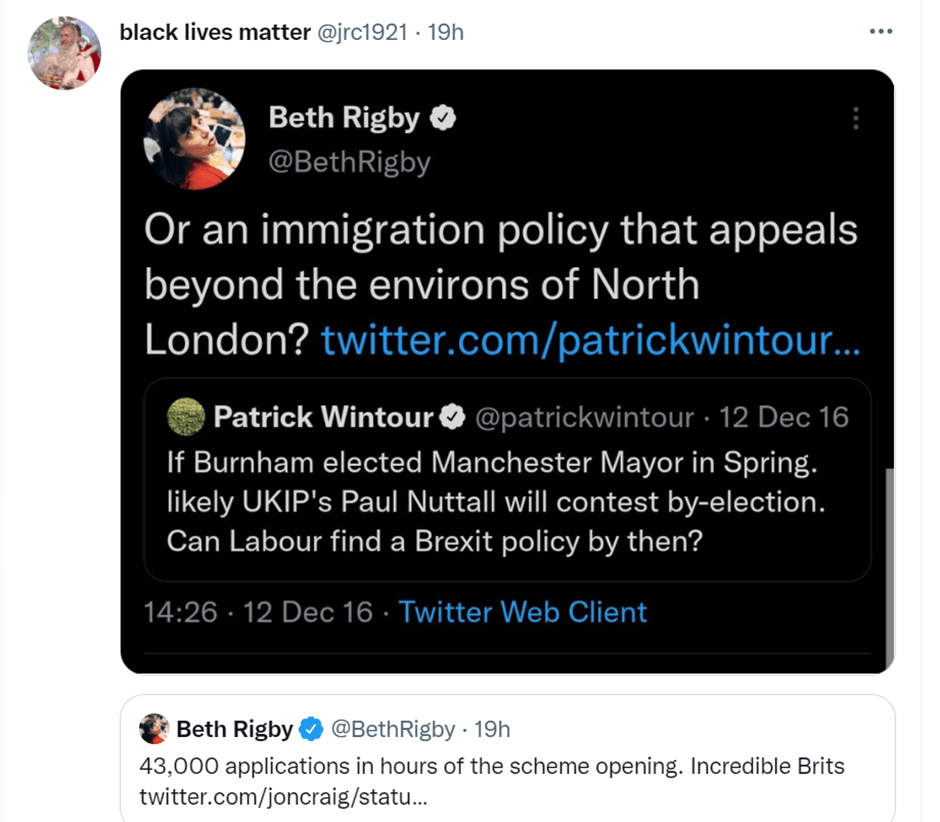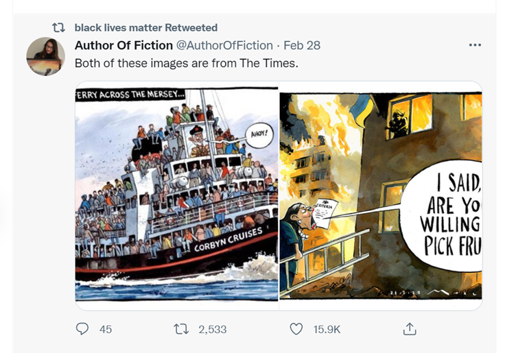 The “Corbyn Cruises” reference is worth highlighting. One of the (many) things UK journalists liked to batter Jeremy Corbyn over the head with was his humanitarian attitude towards refugees fleeing countries bombed by Britain. According to Sky News Political Editor Beth Rigby, this attitude only appealed in “North London”, but she had a different song to sing about Ukrainian refugees…