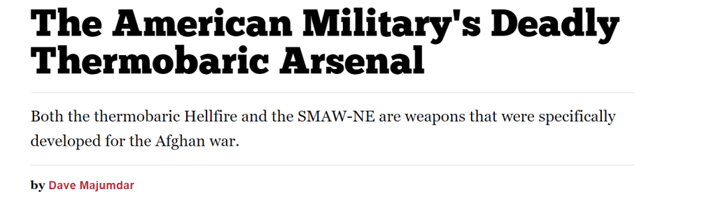 The article itself notes that “the United States has used thermobaric weapons against terrorists in Afghanistan and Iraq” and its title (below) reads like a brag.