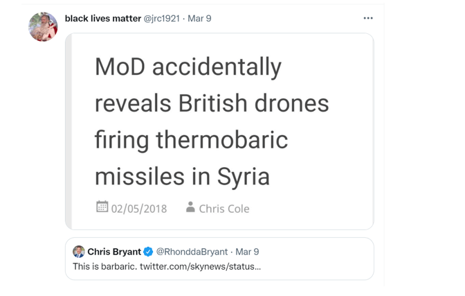 Labour MP Chris Bryant (who we’ve already met in this article) was among those to – accurately – label Russian use of the weapons “barbaric”. What he neglected to mention, alongside the entirety of the Western political-media commentariat, is that the US and the UK cheerfully partake in such barbarity whenever it suits them.