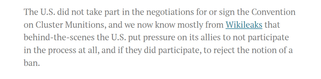 Apparently, not only have the US failed to support a cluster bomb ban, they have used their sizeable influence to undermine the whole process (source):