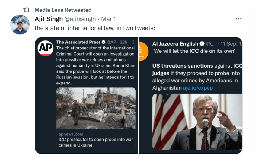 It seems that the International Criminal Court believes in US exceptionalism, too – or is forced to, more like – given the rapidity with which Russia has been investigated for violations of International Law, while crimes in Iraq, Afghanistan and elsewhere are left to the Pentagon to “self-investigate”.