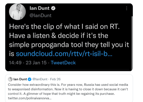 According to Dunt, in January 2015 Russia Today was not “the simple propaganda tool” they tell you – until he told us that it was in February 2022.