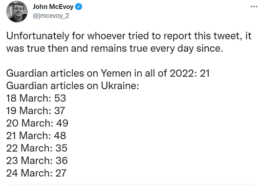 How strange that the “free press” in the UK haven’t subjected this long-running war to similar scrutiny to events in the Ukraine – especially since far more civilians have been killed in Yemen than have so far perished in Eastern Europe.