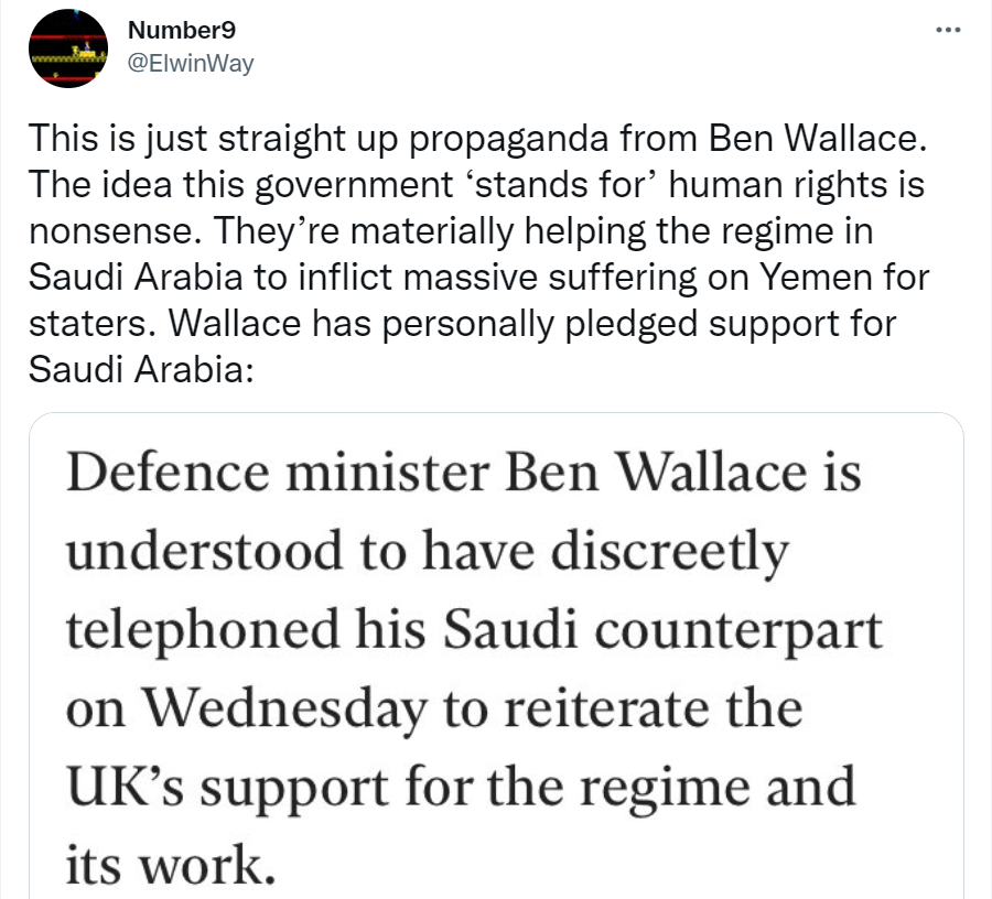Listing all the figures in UK political parties who have expressed support for Saudi Arabia over the years would, like logging all the figures who’ve expressed support for Israel, amount to listing virtually every MP and journalist who operate within the current “Overton Window”. For a current, illustrative example, let’s settle on Defence Minister Ben Wallace: