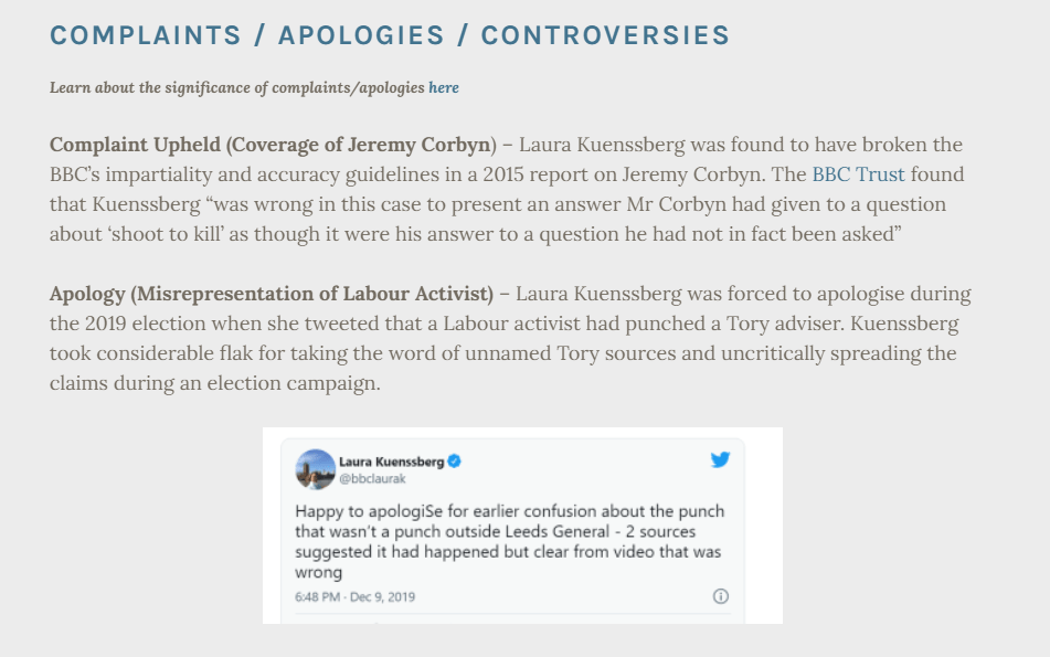 Laura Kuenssberg comes from a wealthy family that is about as establishment as it gets (including links to high-level British colonialism), was privately educated, earns 10 times the salary of the average Briton and there is objective evidence (apology and upheld complaint) of bias against Jeremy Corbyn’s Labour.