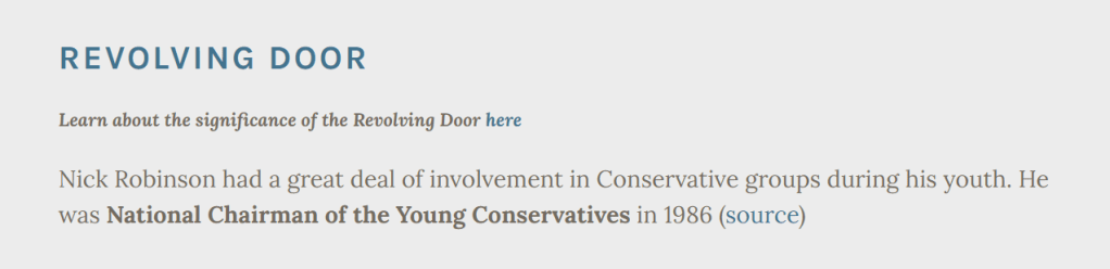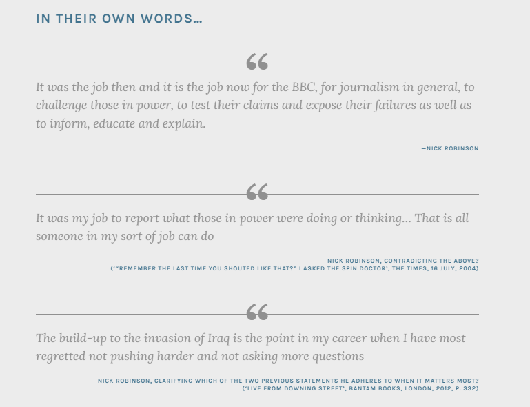Nick Robinson attended a private school and Oxbridge. He was heavily involved in the Conservative Party. He has a personal connection, dating from childhood, to influential journalist Brian Redhead. He earns more than 10 times the salary of the average Briton. By his own admission, he did not push hard enough and ask enough questions in the build up to the Iraq War.