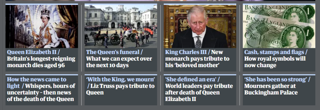 Perhaps of most interest is the response of the leading “left of centre” UK newspaper, The Guardian, to the Queen’s passing. The Guardian love to put out funding pleas saying things like “our journalism is free from influence and vested interests – this makes us different. Our editorial independence and autonomy allows us to provide fearless investigations and analysis of those with political and commercial power. We can give a voice to the oppressed and neglected, and help bring about a brighter, fairer future.”
