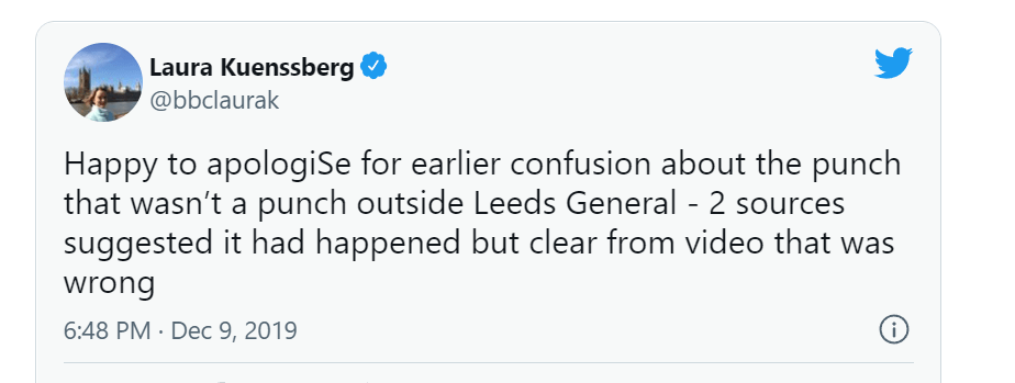 Apology (Misrepresentation of Labour Activist) – Laura Kuenssberg was forced to apologise during the 2019 election when she tweeted that a Labour activist had punched a Tory adviser. Kuenssberg took considerable flak for taking the word of unnamed Tory sources and uncritically spreading the claims during an election campaign.