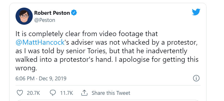 Labour Activist Apology – Robert Peston was forced to apologise during coverage of the 2019 election campaign after claiming that a Labour activist punched a Tory advisor (source)
