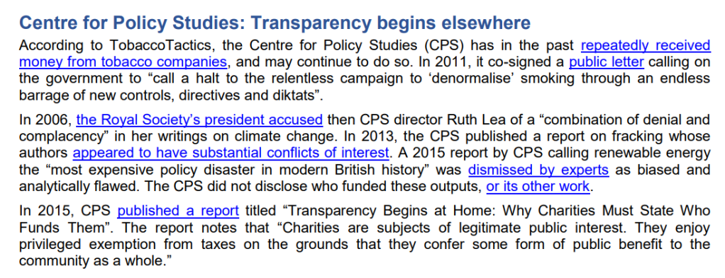Transparify, who monitor the funding of think-tanks, rate Centre for Policy Studies as “highly opaque” (don’t disclose the identity of their funders) and a 2018 report offers the below observations on their work: